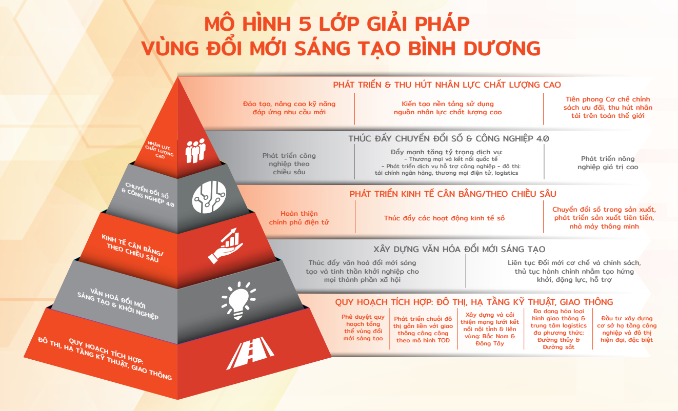Bình Dương đang trên đà trở thành Vùng Đổi mới sáng tạo với 5 động lực chiến lược quan trọng thúc đẩy cho tương lai: (1) Phát triển đô thị gắn với giao thông công cộng (mô hình TOD); (2) Văn hóa đổi mới sáng tạo; (3) Nền kinh tế cân bằng; (4) Chuyển đổi số và Công nghiệp 4.0; (5) Nguồn nhân lực chất lượng cao.